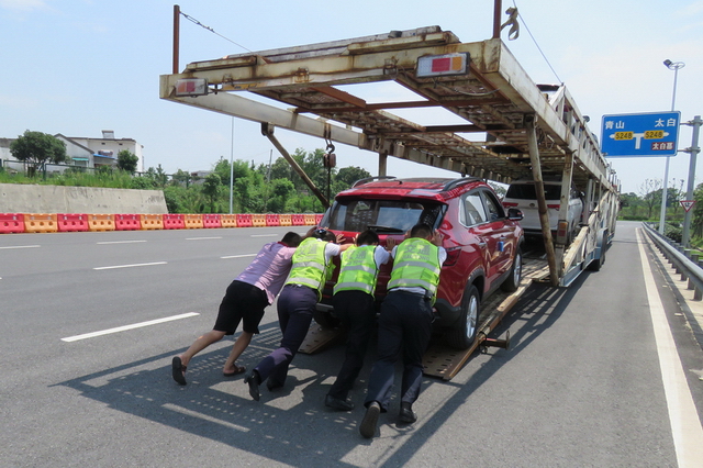 馬鞍山處員工將趴窩的商品車運輸車推至安全位置