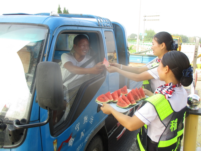 利辛收費站將收費站作為“清涼站“、”服務站“,收費員關雯、田霜霜向司乘送一片片甘甜的西瓜