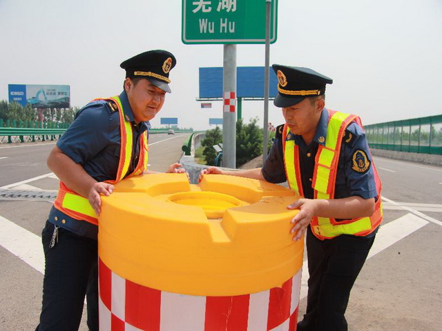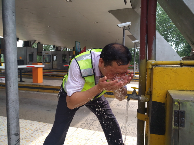 205國道天長收費站疏導員高新用道口水龍頭的水救急解渴