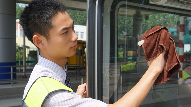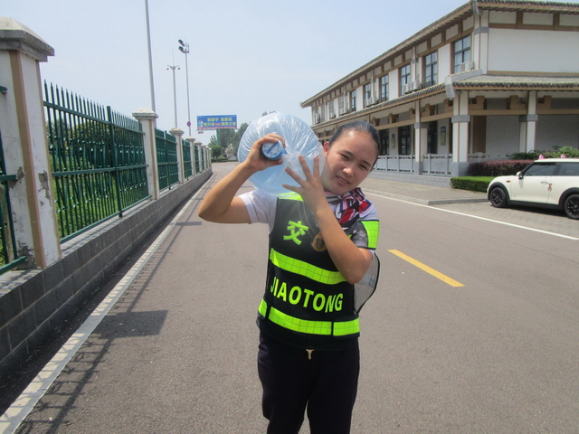 淮南處淮南站女班長龐偉偉頂著烈日為道口送水