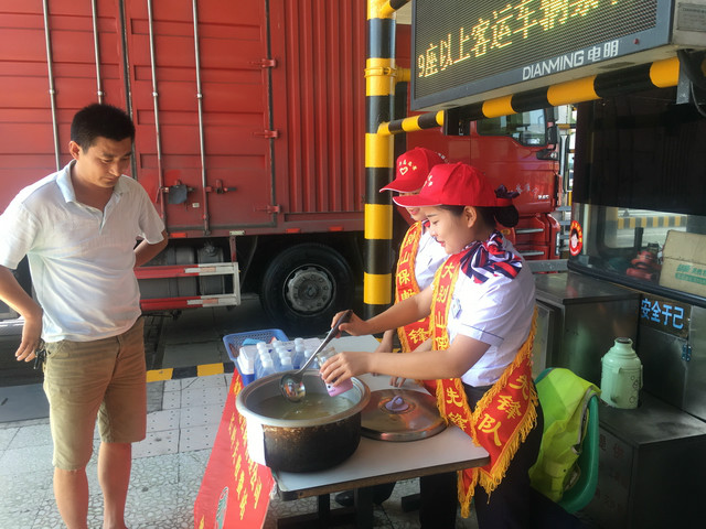 長嶺關收費站“大別山保暢先鋒隊”成員為司乘提供綠豆湯防暑降溫