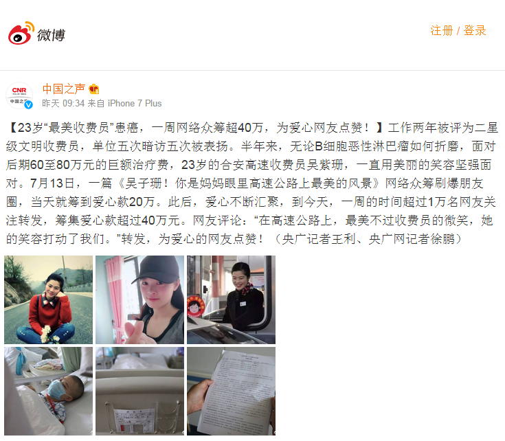 集團上下和社會各方的關心鼓勵,也增強了吳紫珊抗擊病魔的信心。小吳告訴大家,“如果自己康復了,要回到工作中幫助更多的人,還要把剩余的善款全部捐給社會?!边@是高速公路微笑天使的心聲,也是愛心善舉的默默傳遞。