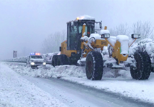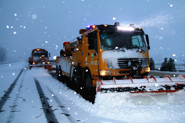 六安北中心采取機械為主、人工為輔的方式在道路全線拋撒融雪劑,大小橋梁、互通匝道等重點部位重點拋撒;雪情加大后,組織平地機、除雪鏟不間斷鏟冰除雪。