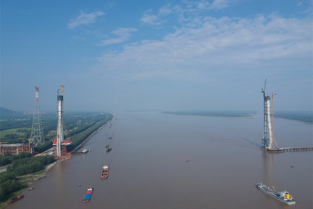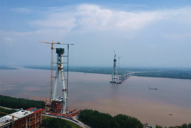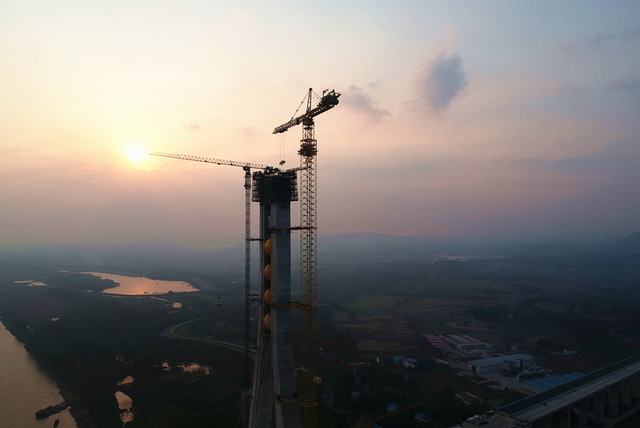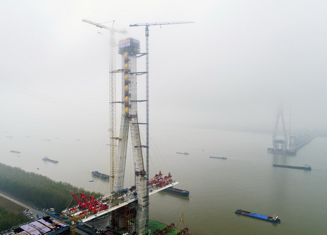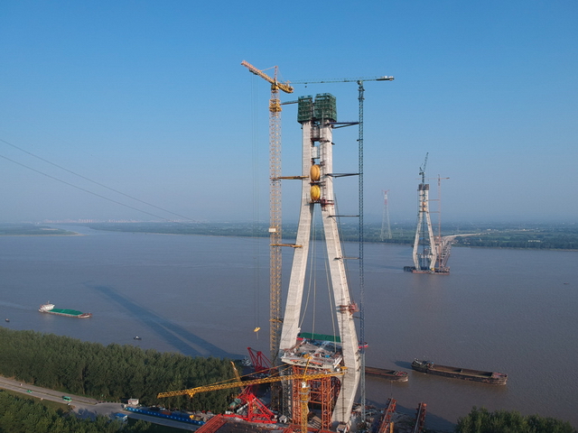 北岸主橋塔高237米,索塔采用新型的結構體系-皮膚功能混凝土和集聚錨鋼橫梁,均為國內首創。項目建設之初,各參建單位集中優勢資源開展了皮膚功能混凝土和集聚錨鋼橫梁科研攻關,最終克服了一道又一道難關,分別于2016年9月開始北主塔首節塔柱施工、2017年12月進行索塔集聚錨鋼橫梁安裝,如期完成了北主塔塔柱和六道集聚錨鋼橫梁安裝施工,向大橋合龍貫通邁出堅實一步。