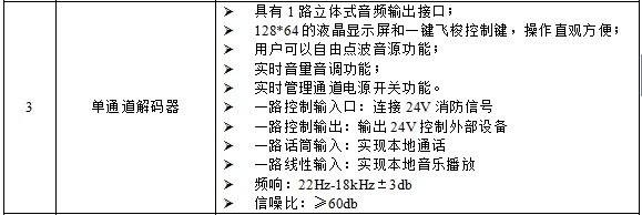 1、 質疑內容:招標文件第七章里“5、背景音樂系統主要設備參數要求”中“單通道解碼器”一項。